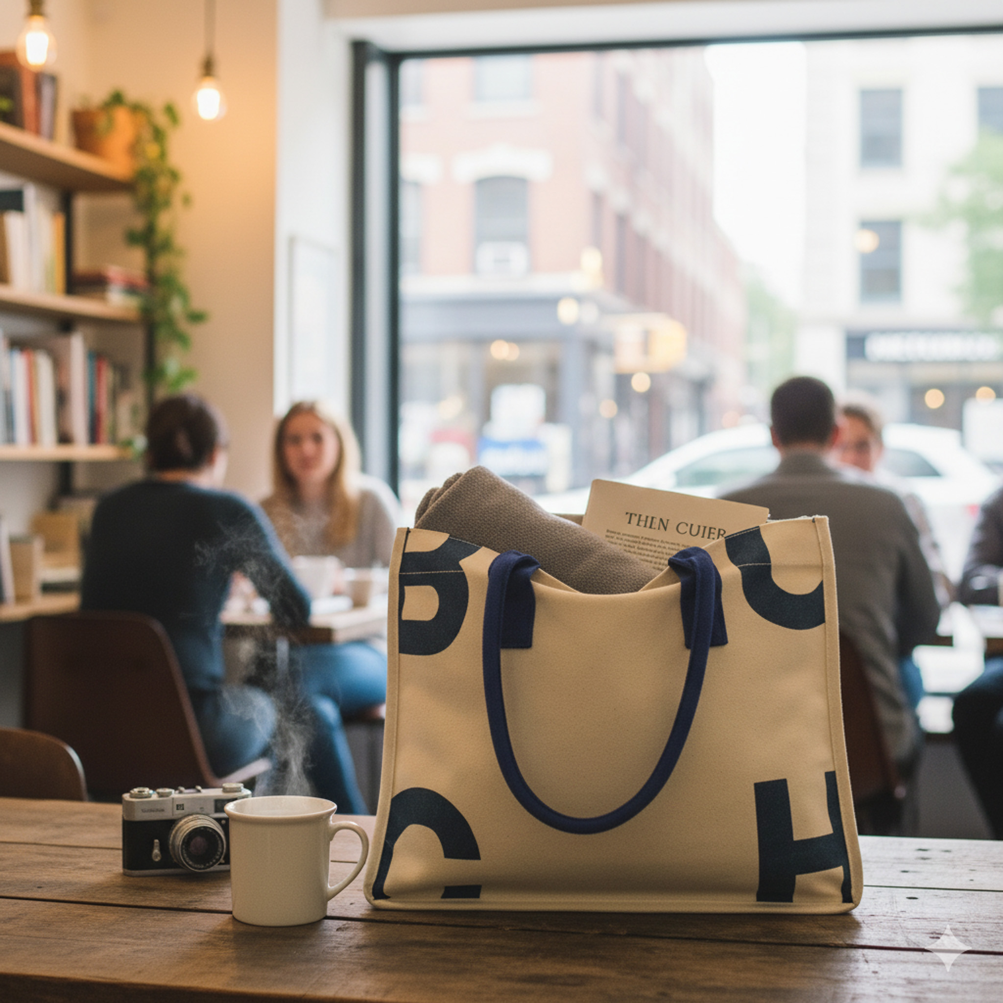 米白帆布搭配深藍粗體字母,營造低調卻有個性的風格,