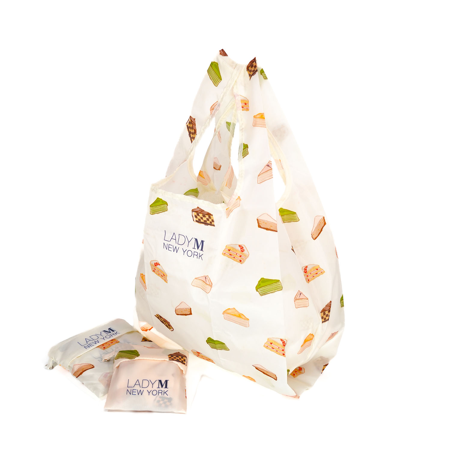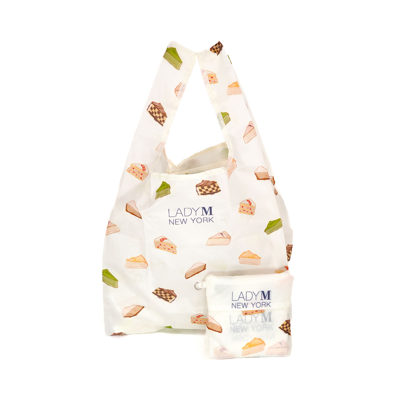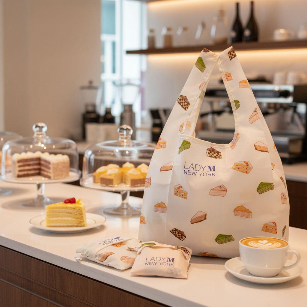 以經典千層蛋糕為靈感,袋身滿佈 LADY M 代表性蛋糕圖案,像是把甜點店的浪漫搬回家。柔和奶白底搭配繽紛切片色塊,呈現出優雅又療癒的氛圍,走在街上也是最吸睛的時尚配件。